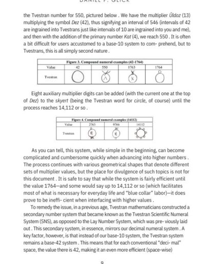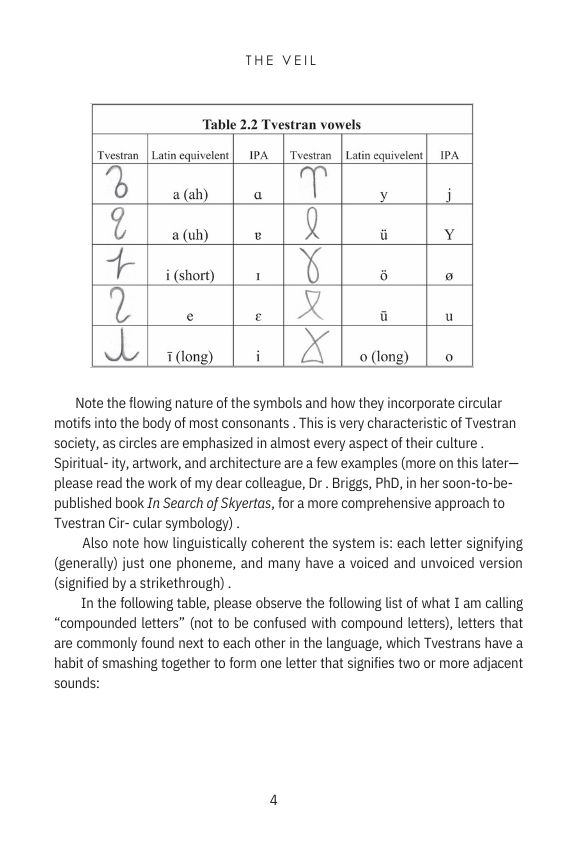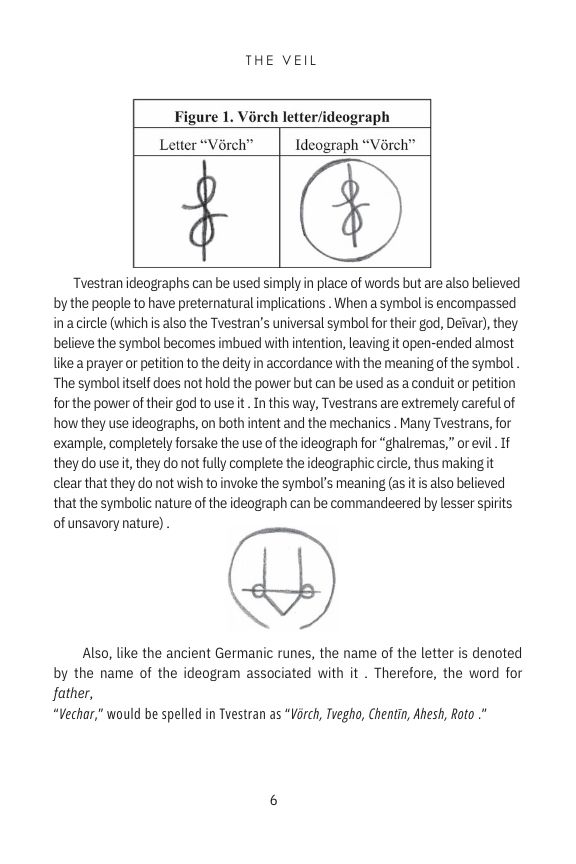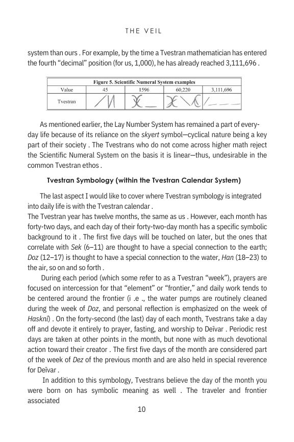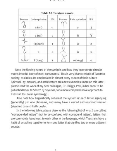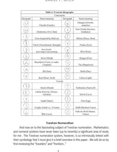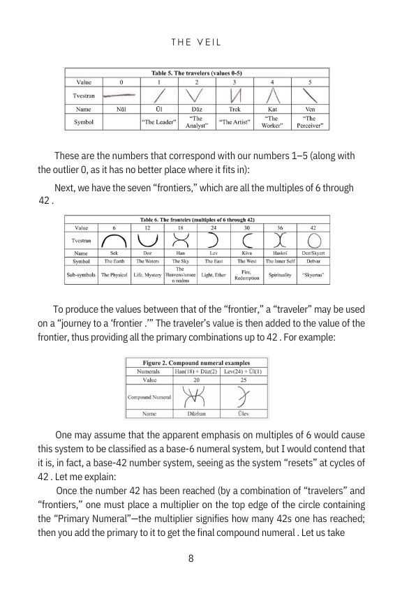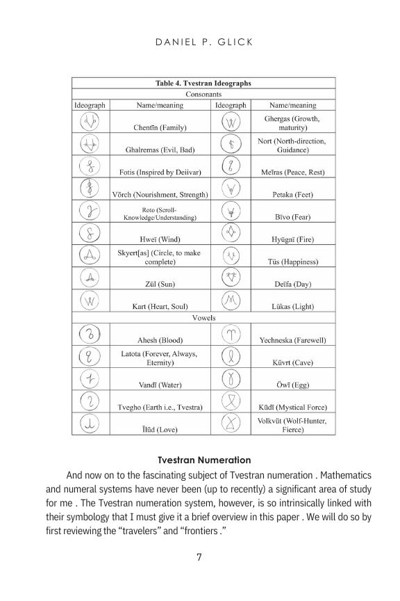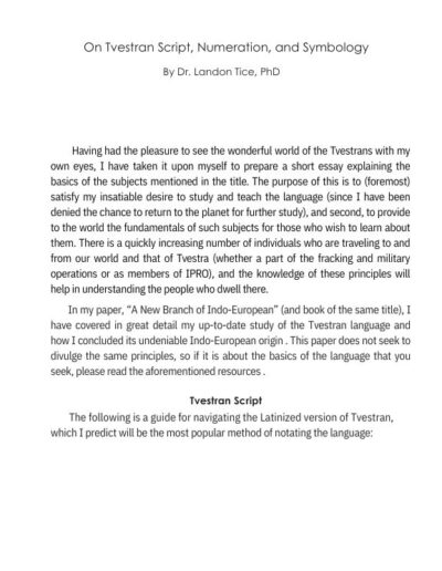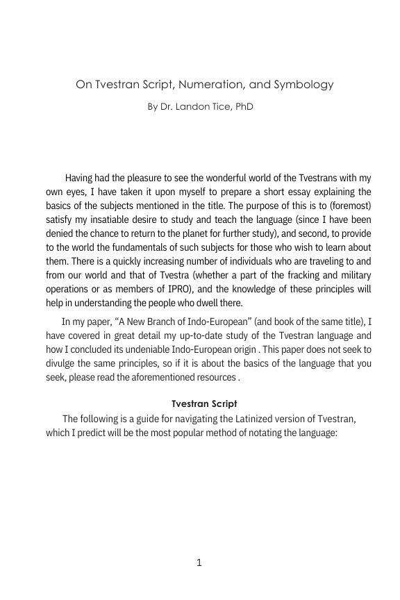 The following document, entitled “On Tvestran Script, Numeration, and Symbology”, is written by the fictitious Dr. Landon Tice, who is a supporting character in The Veil. The document contains the following information: